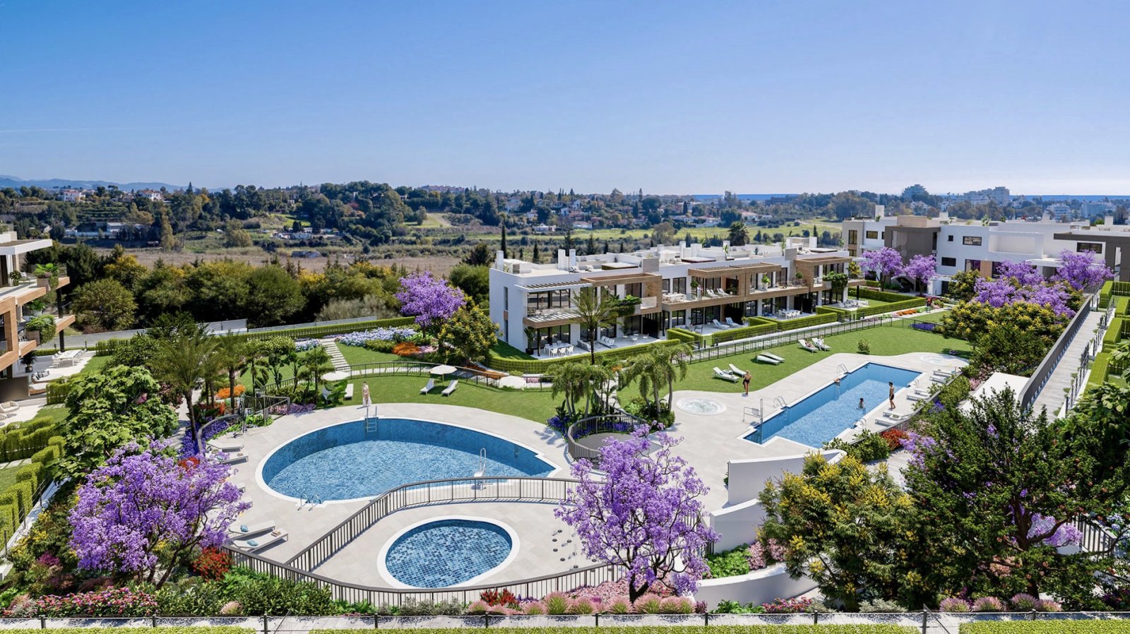 Die Eigentümer genießen den Zugang zu den beeindruckenden Gemeinschaftsbereichen der Anlage: einem großen Pool für Erwachsene, Kinderbecken, Whirlpools, Fitnessraum, Yogabereich, Boccia-Zone und einem Kinderspielplatz – eingebettet in gepflegte Grünanlagen mit mediterraner Bepflanzung.